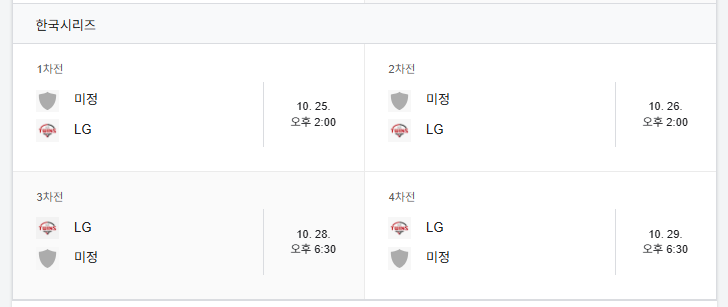 | 한국시리즈 | 정규 시즌 1위 LG 트윈스 | 잠실 | 10월 25일 |